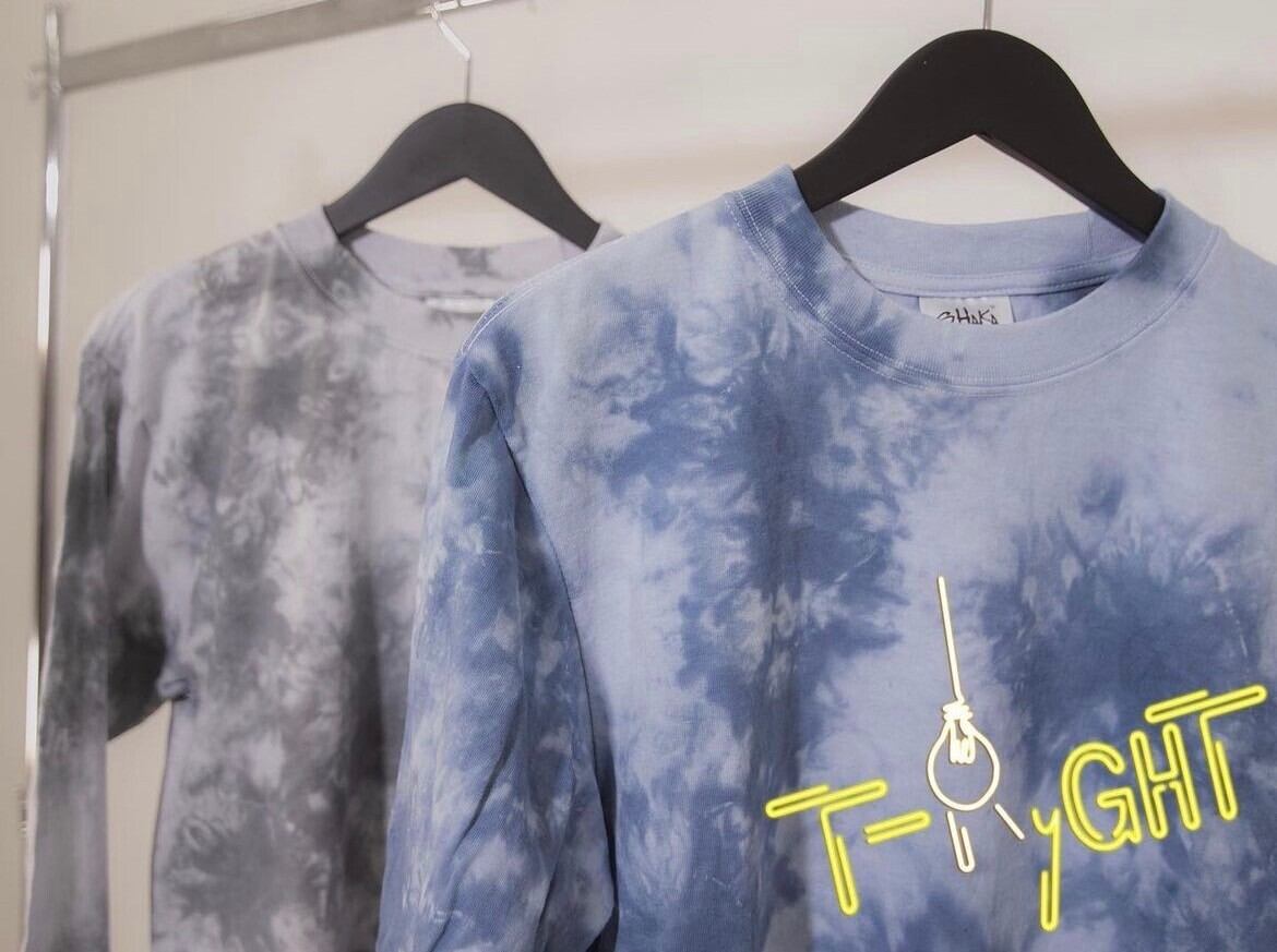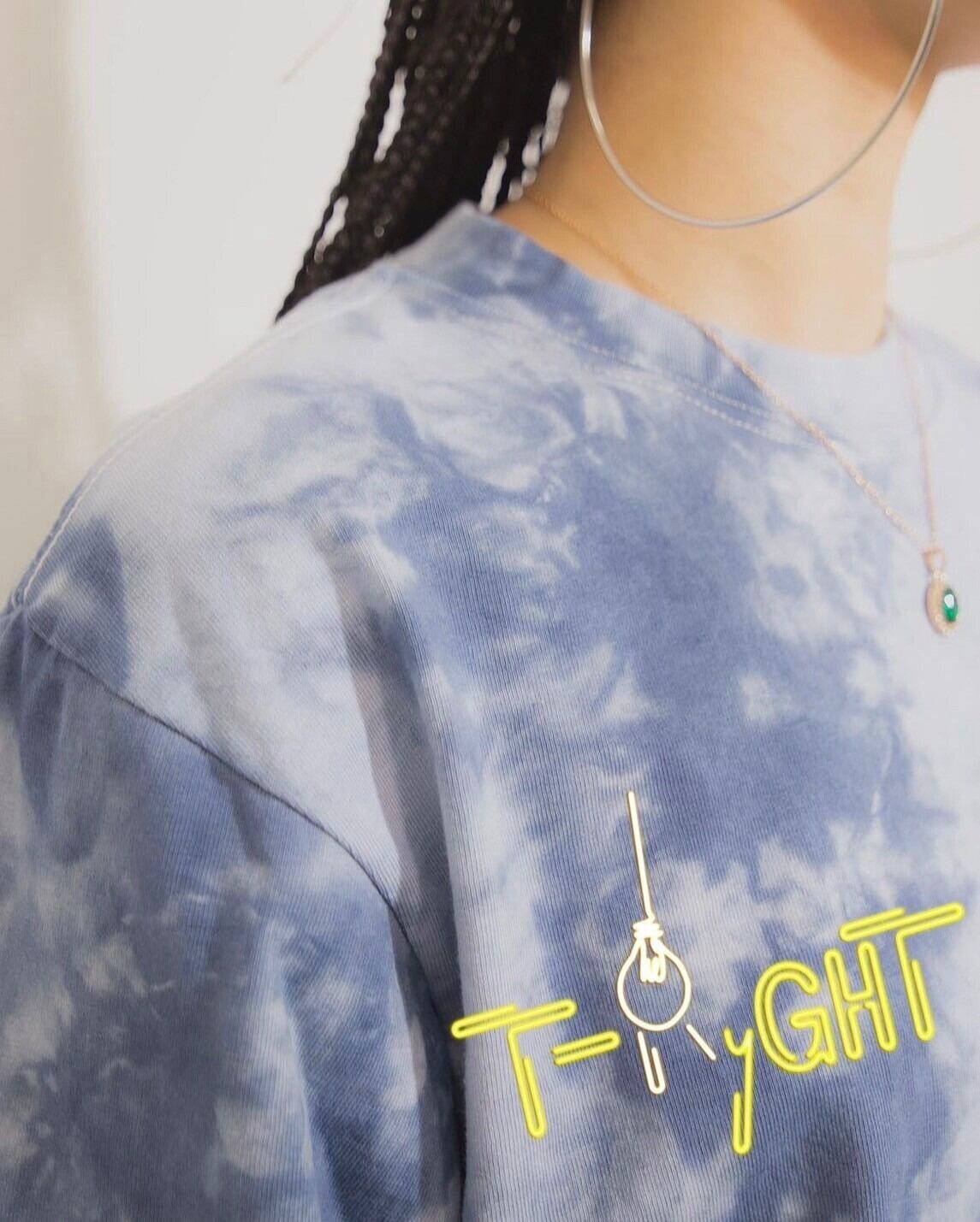 ホワイトロンTを2 colorで染め上げた作品。手で染めて絵柄がどのように出るかは完成するまでわからない。二つと無いタイダイ柄のオリジナルTシャツが完成。